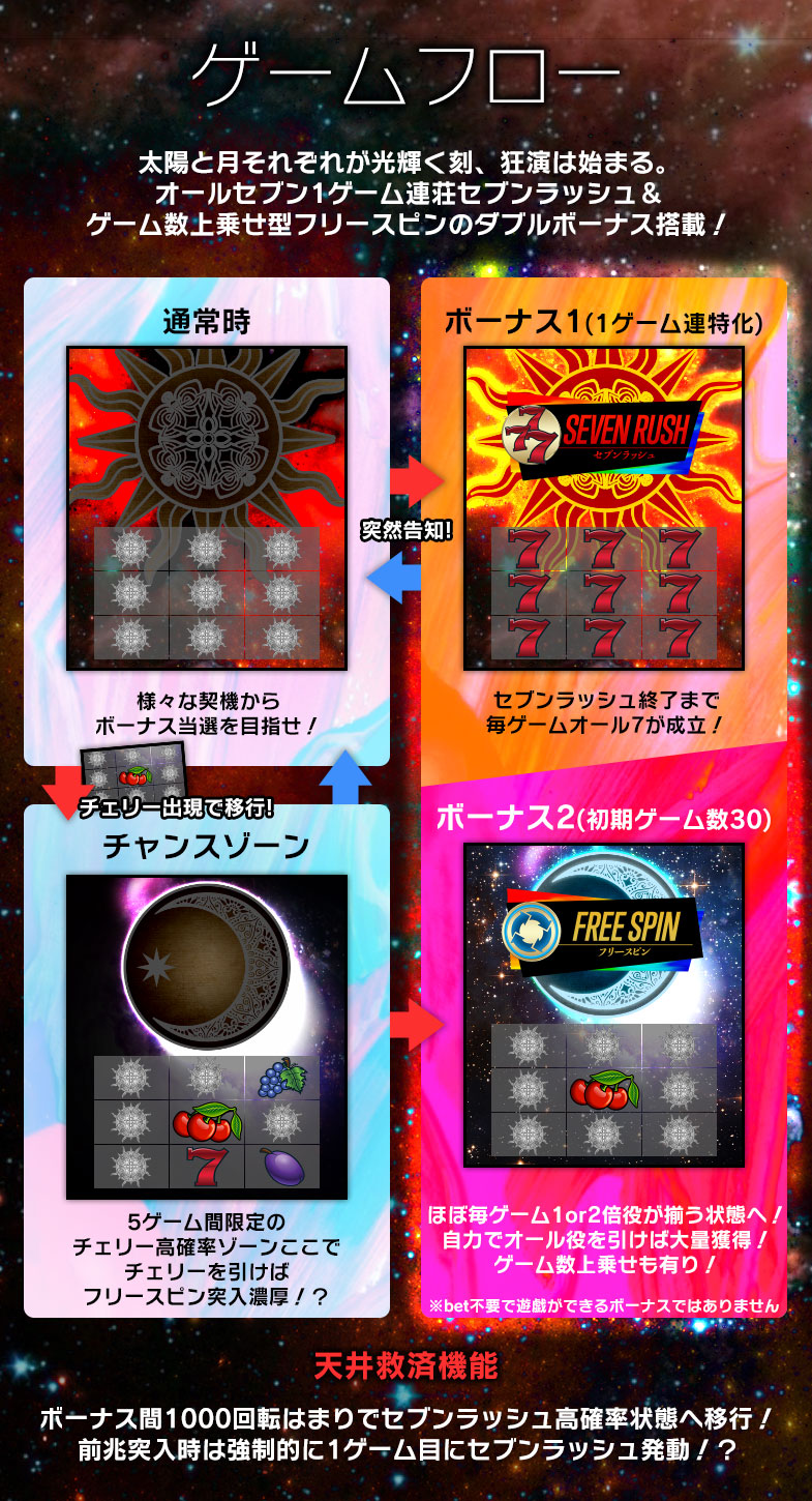 機種のスペックや、省電力モード等の性能を制限する機能がONの場合、リール停止や演出が正常に表示されない可能性がございます。