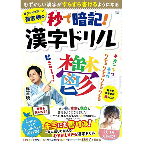 オジンオズボーンの篠宮暁さんによる初の著書 『オジンオズボーン篠宮暁の秒で暗記! 漢字ドリル』がついに登場! 「鬱」や「薔薇」といった画数の多い難しい漢字も、分解してリズムに合わせて声に出せば、 楽しく“秒で”覚えられるようになる、画期的な本です! |